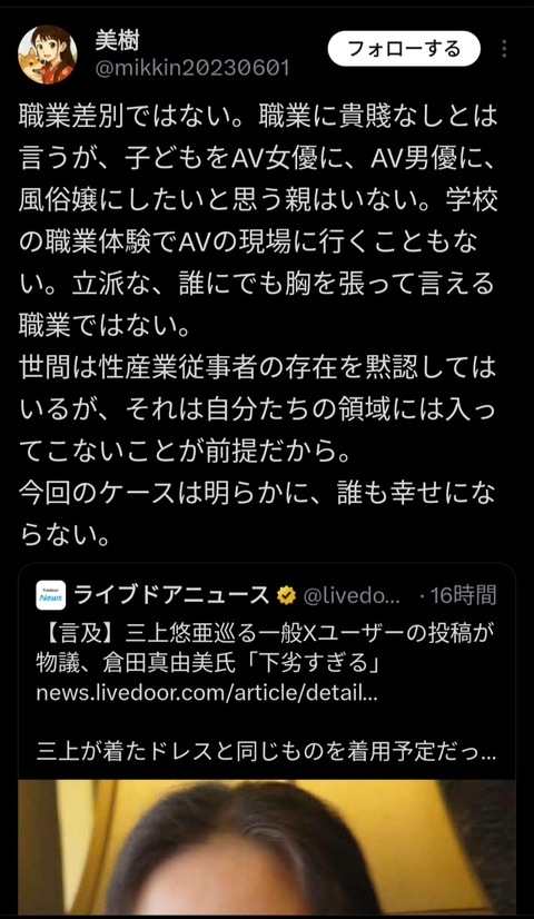 【画像】女さん「セクシー女優を差別するのは職業差別ではない」 Twitter Facebook はてブ LINE コピー 2025.08.02 スポンサーリンク 1:それでも動く名無し:2025/08/02(土) 10:30:55.29 ID:yvGDRKBx0 2:それでも動く名無し:2025/08/02(土) 10:31:34.36 ID:7+lhPRGZ0 正論は伸びない 4:それでも動く名無し:2025/08/02(土) 10:32:15.05 ID:r8JZUQPC0 誰も幸せにならないと書いているが俺は楽しい 続きを読む