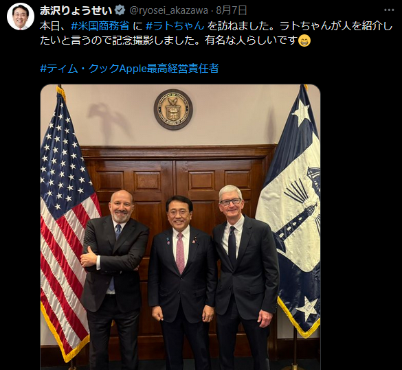 赤沢亮正、米国要人を「ラトちゃん!ベッちゃん!(笑)グリとグラ!トラ!!」 頭おかしくねえか? Twitter Facebook はてブ LINE コピー 2025.08.08 スポンサーリンク 1: 三毛(ジパング) [BR] 2025/08/08(金) 15:34:34.68 ID:Ds5estZu0● BE:897196411-PLT(21000) 訪米中の赤沢経済再生相、商務長官を「ラトちゃん」、財務長官を「ベッちゃん」とX投稿https://www.sankei.com/article/20250808-4XP5QB47MFFHFADQNP5DWIZRXE/https://x.com/ryosei_akazawa/status/1953152261154034162https://x.com/ryosei_akazawa/status/1953609433441087987 続きを読む