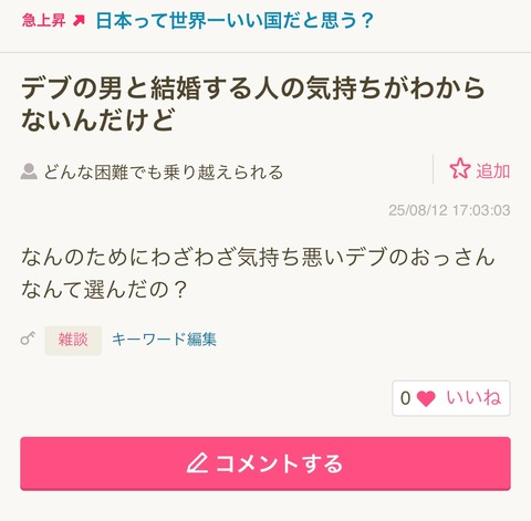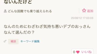 【画像】婚活女子「気持ち悪いデブのおっさんとだけは結婚したくない🤮」→豚丼男性発狂wwwwwwww Twitter Facebook はてブ LINE コピー 2025.08.14 スポンサーリンク 1:それでも動く名無し:2025/08/13(水) 09:24:55.84 ID:M7a3mq3G0.net 2:それでも動く名無し:2025/08/13(水) 09:25:16.16 ID:M7a3mq3G0.net デブの男と結婚する人の気持ちがわからないんだけど どんな困難でも乗り越えられる 追加 25/08/12 17:03:03 なんのためにわざわざ気持ち悪いデブのおっさんなんて選んだの? 3:それでも動く名無し:2025/08/13(水) 09:26:09.38 ID:CnJcE66n0.net 豚丼ってデブの男の意味になったのか 続きを読む