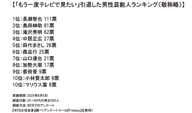 「もう一度テレビで見たい」引退した男性芸能人!3位滝沢秀明氏、2位島田紳助氏を抑えた1位は?
