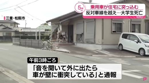 10代の男女3人が乗った車が住宅に突っ込む 女子大学生(19)死亡「大きな衝突音がして…」三重・松阪市