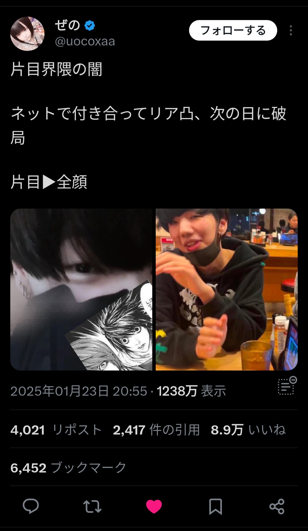 【画像】Z世代「片目イケメンと付き合った結果wwwwww」 Twitter Facebook はてブ LINE コピー 2025.08.23 スポンサーリンク 1:以下、?ちゃんねるからVIPがお送りします:2025/08/23(土) 13:18:09.284 ID:Tsy0IUKK0 2:以下、?ちゃんねるからVIPがお送りします:2025/08/23(土) 13:18:56.767 ID:pcAJgpJn0 片目の方もイケメンか? 5:以下、?ちゃんねるからVIPがお送りします:2025/08/23(土) 13:19:08.847 ID:/4uHAt4x0 波田陽区定期 続きを読む