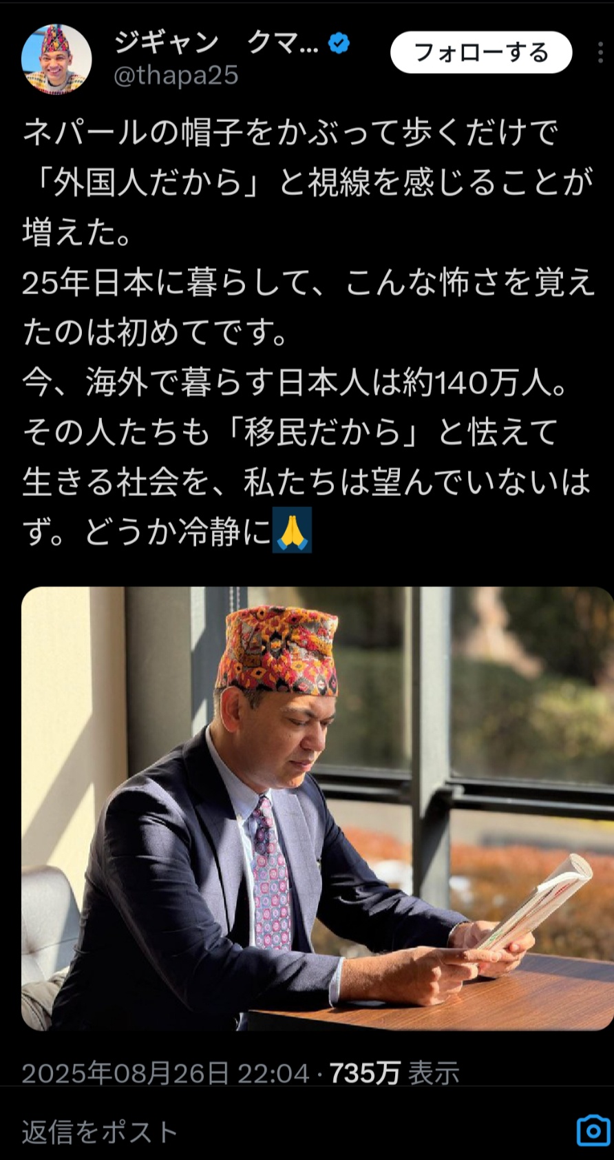 【画像】ネパール人男性「25年間日本に暮らしてこんな怖さを覚えたのは初めて」 Twitter Facebook はてブ LINE コピー 2025.08.29 スポンサーリンク 1:それでも動く名無し:2025/08/28(木) 23:52:35.02 ID:GmX6FbxH0 3:それでも動く名無し:2025/08/28(木) 23:54:29.77 ID:Jq/2+Sm90 可哀想やけどしゃーない 5:それでも動く名無し:2025/08/28(木) 23:55:29.80 ID:bDYMiOZn0 帰るときが来たな 7:それでも動く名無し:2025/08/28(木) 23:56:11.15 ID:s9Bu1CcJ0 ネパール人差別なんて無いから気にするな 続きを読む