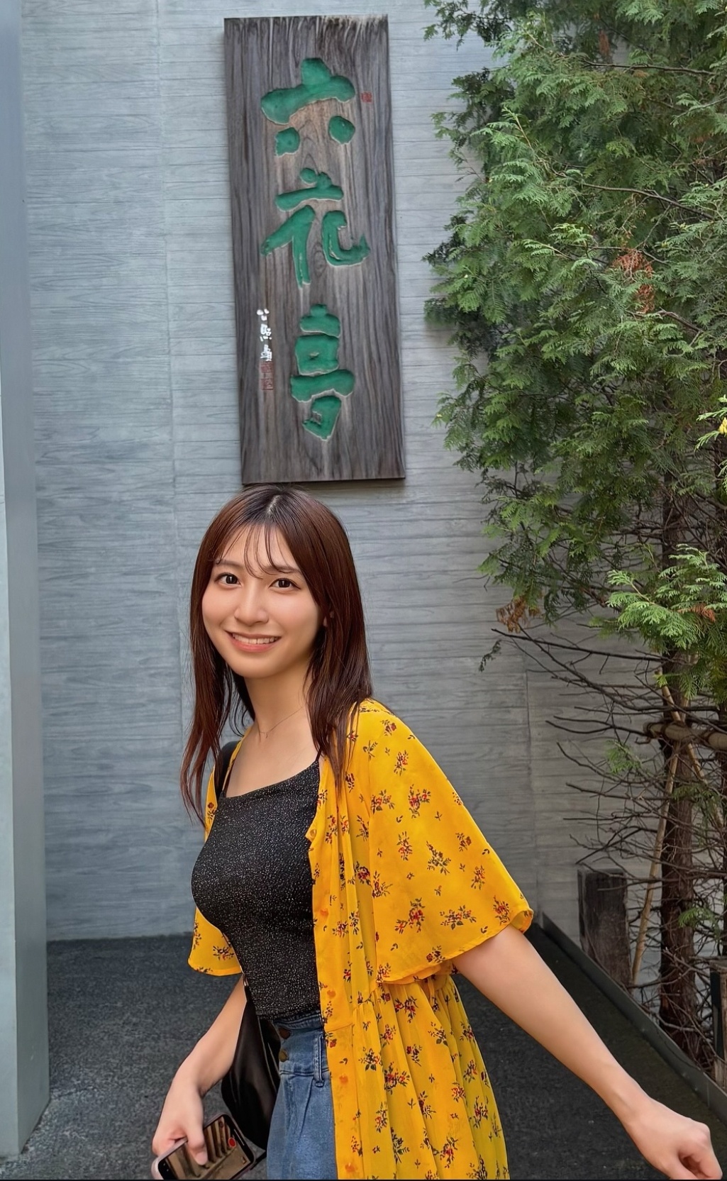 黒のキャミソールとデニム、オレンジのロング丈カーディガンを羽織った夏らしい姿で「五稜郭が望める人気スポットの六花亭 五稜郭店はお店の入口も素敵でした」と、函館を満喫した様子。