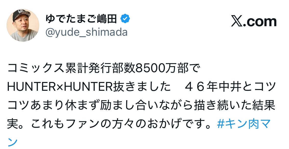 キン肉マン作者「累計発行部数でHUNTER×HUNTER抜きました。休まず描いた結果です。」 Twitter Facebook はてブ LINE コピー 2025.09.04 スポンサーリンク ◇ 1: 名無し 2025/09/04(木) 15:10:25.32 ID:HQqUNPBa0 お、煽りか? https://x.com/yude_shimada/status/1963382991222100405 ◇ 2: 名無し 2025/09/04(木) 15:11:01.23 ID:T7jTqOpZ0 またコイツかよ… ◇ 11: 名無し 2025/09/04(木) 15:12:02.73 ID:QvGBJCo20 いちいちそこは言わなくていいやんw 続きを読む