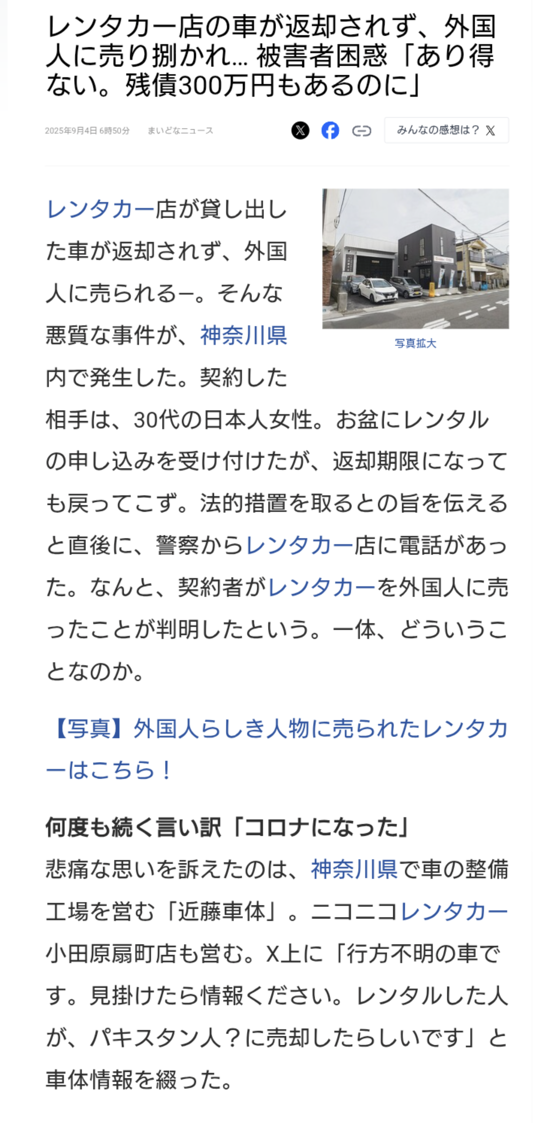 【悲報】女さん、借りたレンタカーを外国人に売ってしまうwwwwwwwwwww Twitter Facebook はてブ LINE コピー 2025.09.04 スポンサーリンク 1:それでも動く名無し:2025/09/04(木) 17:55:33.28 ID:DQhBQYOpd しかも旦那には盗まれたと嘘をついてしまう。 2:それでも動く名無し:2025/09/04(木) 17:56:27.16 ID:4bACkycn0 精神的な病気を患ってるを理由にするな 3:それでも動く名無し:2025/09/04(木) 17:56:35.58 ID:qLPKczP70 知能が女すぎる 続きを読む