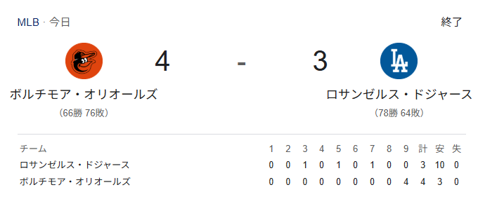 ドジャースが9回2死まで先発した山本由伸投手が無安打無失点で抑える快投を見せて3―0でリードしていたが、まさかの大逆転でのサヨナラ負けを喫した。 pic.twitter.com/E0TJBjg3fO