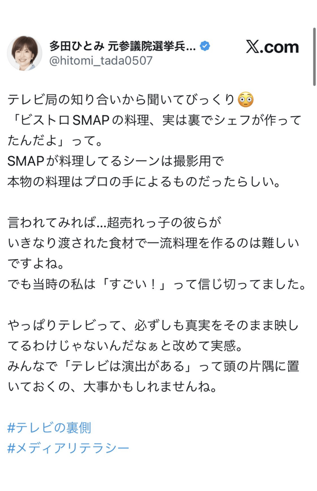【大炎上】「ビストロSMAP、実は裏でプロが作ってた」発言の政治家、謝罪するもさらに火に油を注ぐ事態に Twitter Facebook はてブ LINE コピー 2025.09.13 スポンサーリンク 1: (御前山) [ニダ] 2025/09/13(土) 00:15:26.34 ● BE:977790669-2BP(2000) https://www.jprime.jp/articles/-/38328?display=b 続きを読む