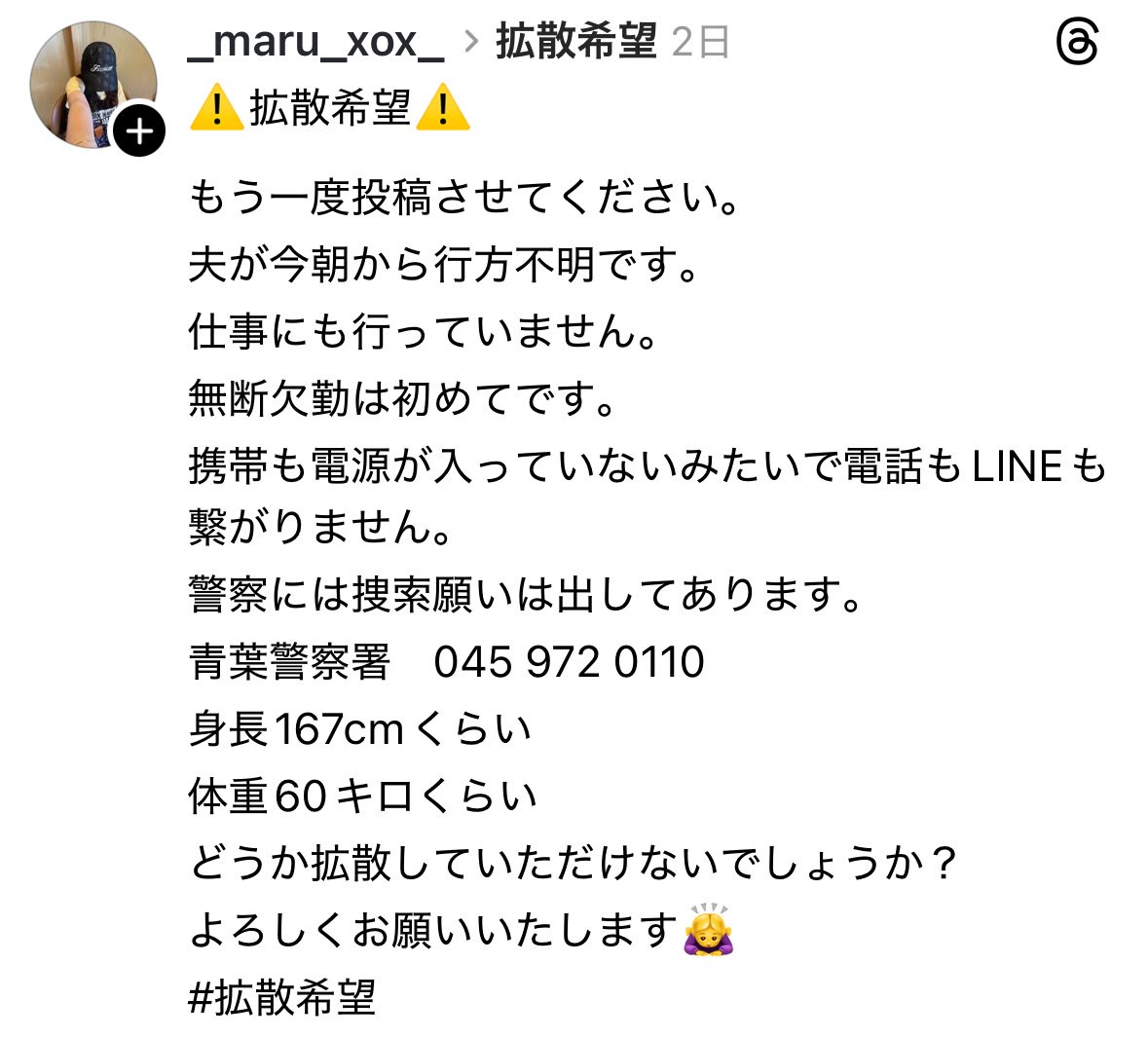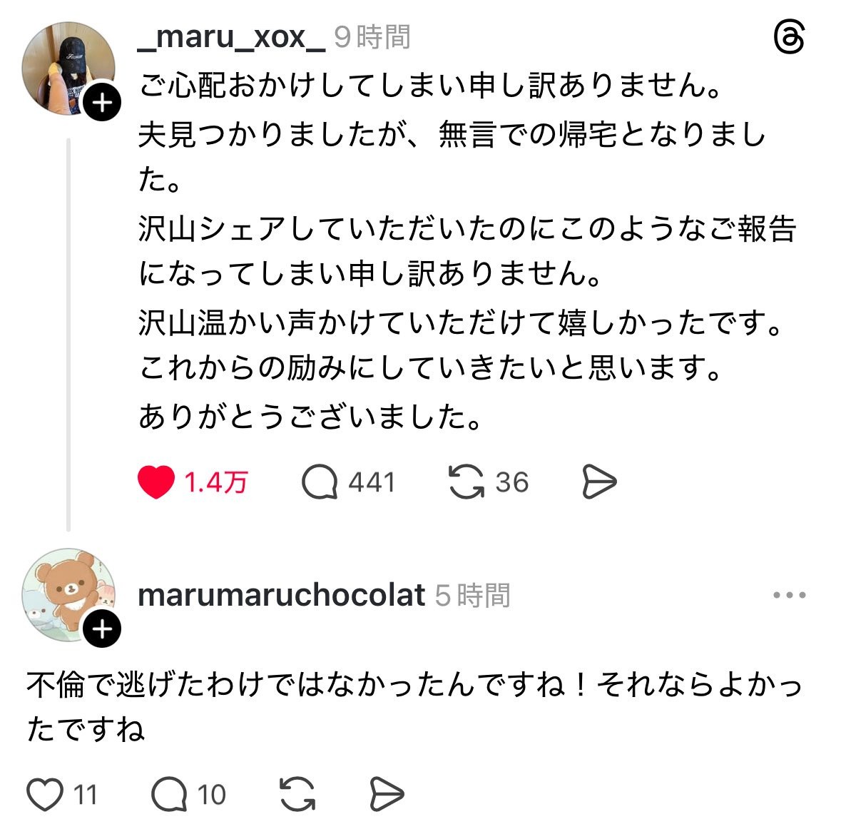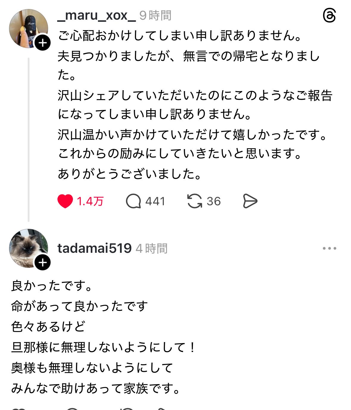Threadsの話だけど「行方不明だった夫が無言の帰宅となりました」という報告に対して「命があってよかったです!」「今は色々聞かないであげて下さい!」とレスしている人々がいて、うわーってなってる。