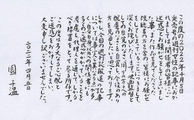 【謝罪】園子温監督、性加害報道受け「配慮のなさ自覚」https://t.co/L2Kxp77RZB