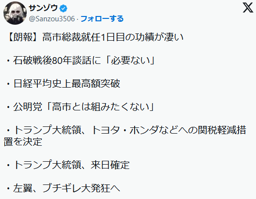 【朗報】高市さん、早速成果を出してしまう Twitter Facebook はてブ LINE コピー 2025.10.07 スポンサーリンク 1: 名無しさん@おーぷん 25/10/07(火) 11:01:44 ID:2mY8 続きを読む
