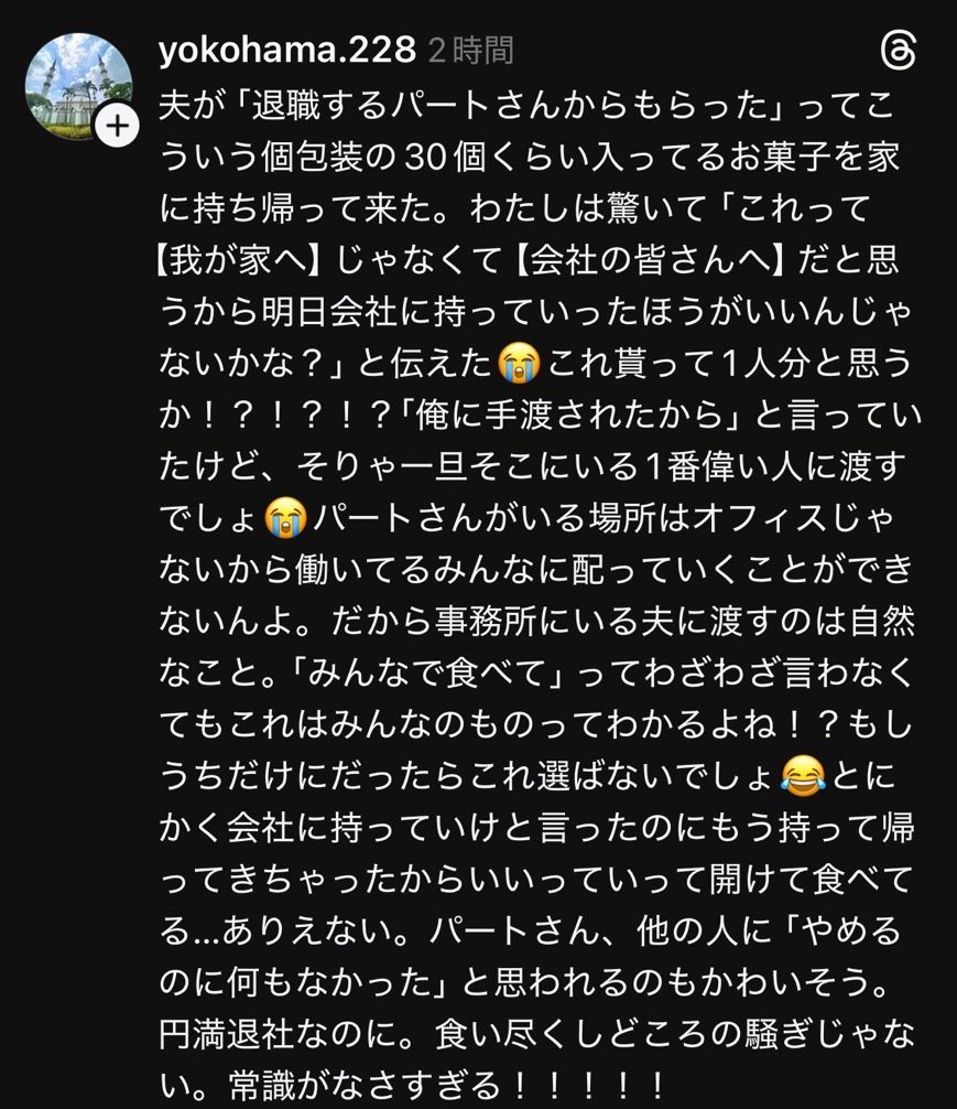 【悲報】夫さん、退職するパートさんから貰ったお菓子を家に持ち帰ってしまい妻ブチギレ Twitter Facebook はてブ LINE コピー 2025.10.20 スポンサーリンク ◇ 1: 名無し 2025/10/20(月) 20:56:20.49 ID:JuSCsoaH0 おお… https://www.threads.com/@yokohama.228/post/DQAvBHnk4pt ◇ 2: 名無し 2025/10/20(月) 20:57:19.26 ID:2sBSU1P60 まあいいじゃん ◇ 3: 名無し 2025/10/20(月) 20:58:01.12 ID:+zycs5H00 草 ある意味コミュ障や 続きを読む