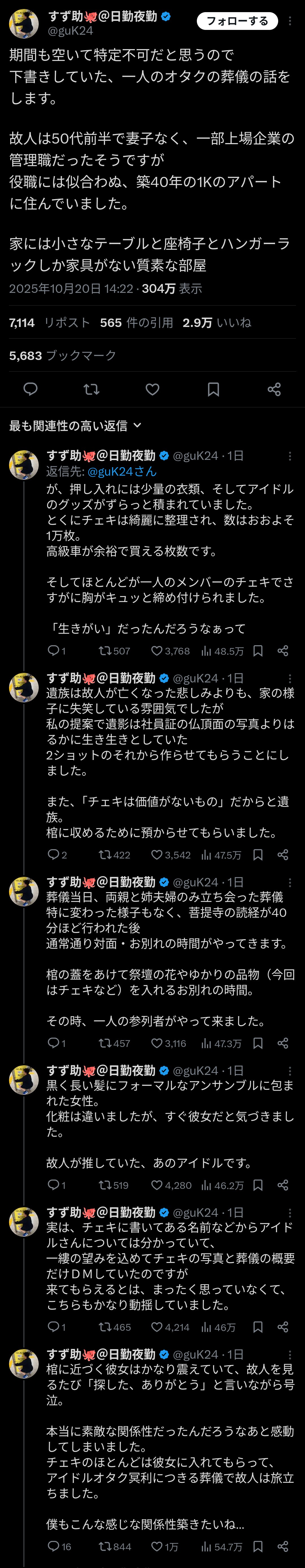 50代前半で亡くなった一人のアイドルオタクの話… 故人の部屋には必要最低限の家具しかなかったが、押し入れには大量のチェキがあり「生きがい」だったんだなあと感じた 葬儀屋が故人の部屋で発見した1万枚のチェキから、推しアイドルにDMで連絡。葬儀にアイドル本人が現れ、棺の前で号泣しながら「探した、ありがとう」と語った奇跡の物語。本当に素敵な関係性だったんだろうなあと感動してしまいました。画像
