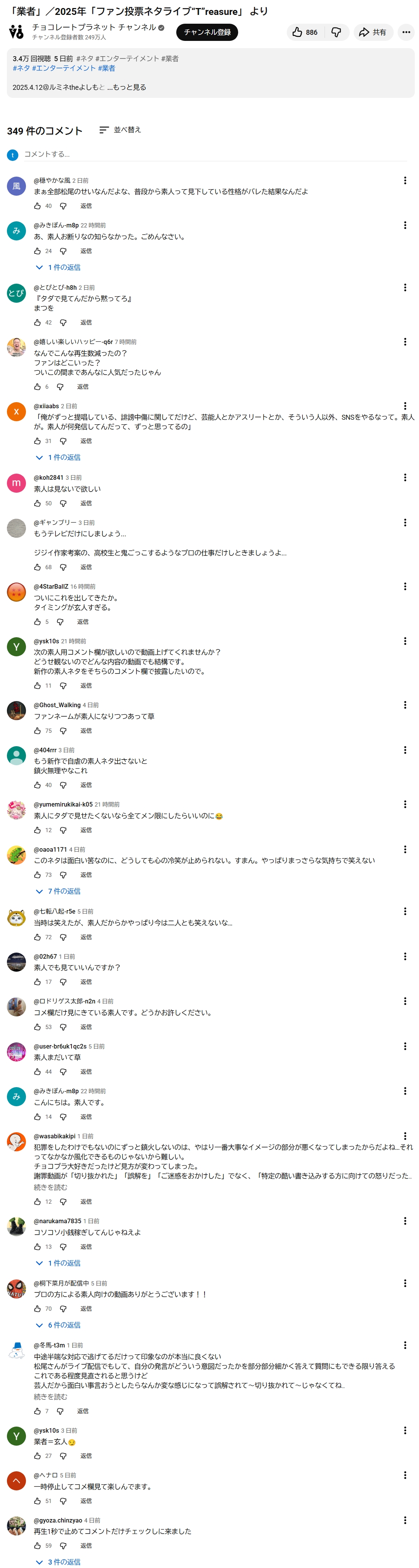 【画像】チョコプラの最新youtubeのコメント欄wwwwwwwwww Twitter Facebook はてブ LINE コピー 2025.10.25 スポンサーリンク 1:それでも動く名無し:2025/10/25(土) 18:40:37.49 ID:mbrYP3cs0 2:それでも動く名無し:2025/10/25(土) 18:46:36.01 ID:UAox8VRv0 登録者数と動画の再生数があんま合ってないな 半分の登録者数のガーリィレコードとどっこいやんけ 続きを読む