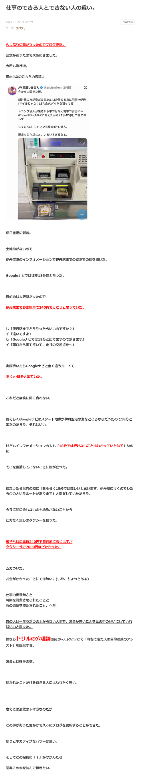 「会食に間に合わない&土地勘がないことから仕方なく流しのタクシーを拾った。気持ちは電車賃240円で目的地に着くはずがタクシー代で7000円ほどかかった。ムカついた。お金がかかったことにでは無い。(いや、ちょっとある)仕事の出来無さと時間を消費させられたことと 負の感情を持たされたこと、へだ。あの人は一生うだつの上がらない人生で、お金が無いことを世の中のせいにしていればいいと思った」とした。