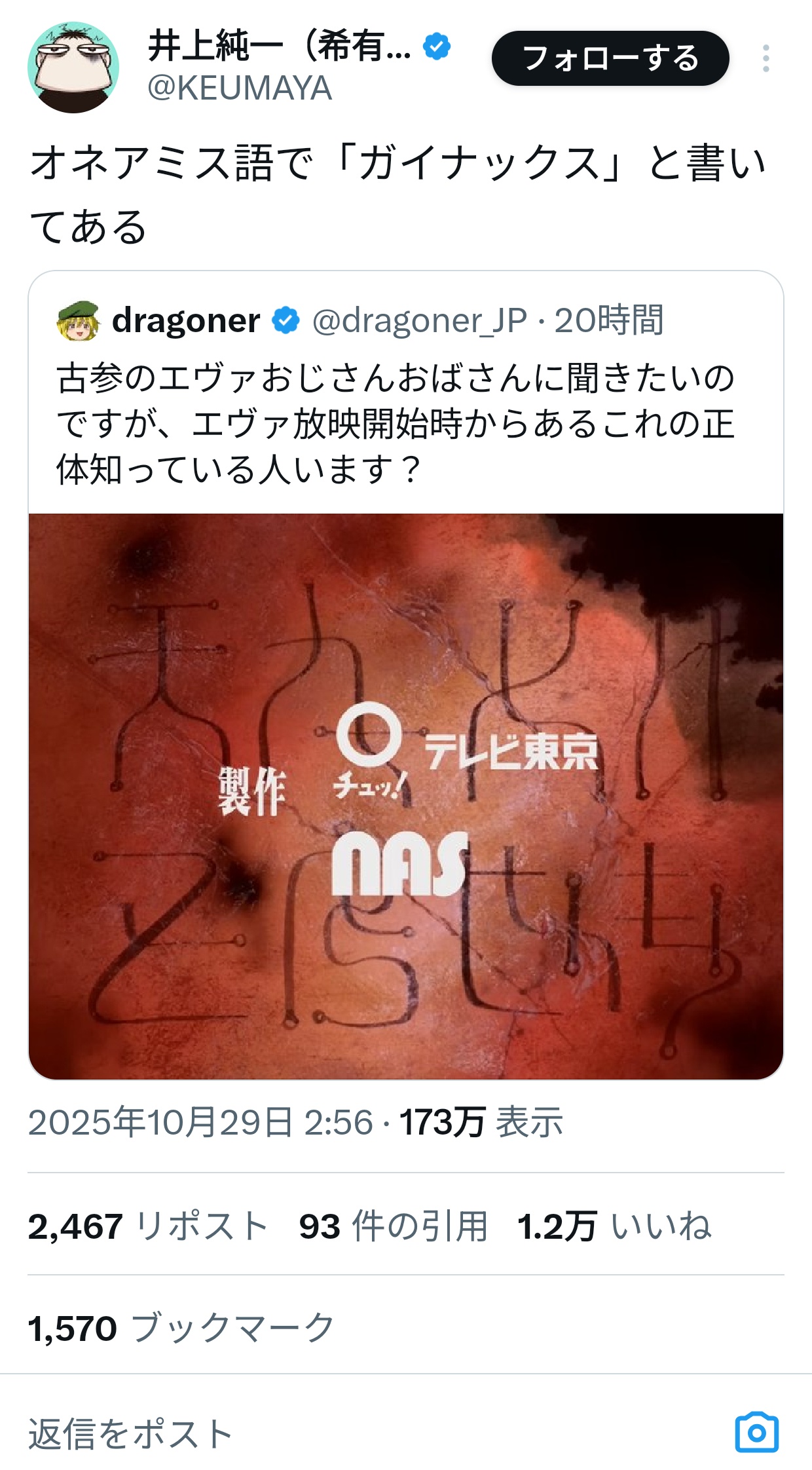 【画像】エヴァで長年の謎だったこれ、ついに正体が判明する Twitter Facebook はてブ LINE コピー 2025.10.30 スポンサーリンク 1:以下、?ちゃんねるからVIPがお送りします:2025/10/29(水) 20:02:31.062 ID:bqyUJ/2OMNIKU.net はぇー… 3:以下、?ちゃんねるからVIPがお送りします:2025/10/29(水) 20:09:50.526 ID:OnYEYd7b0NIKU.net これ嘘だぞ 4:以下、?ちゃんねるからVIPがお送りします:2025/10/29(水) 20:11:53.704 ID:gduQqLi30NIKU.net >>3 言ってるのエヴァの機体をデザインしたバリバリの関係者なんだが 続きを読む