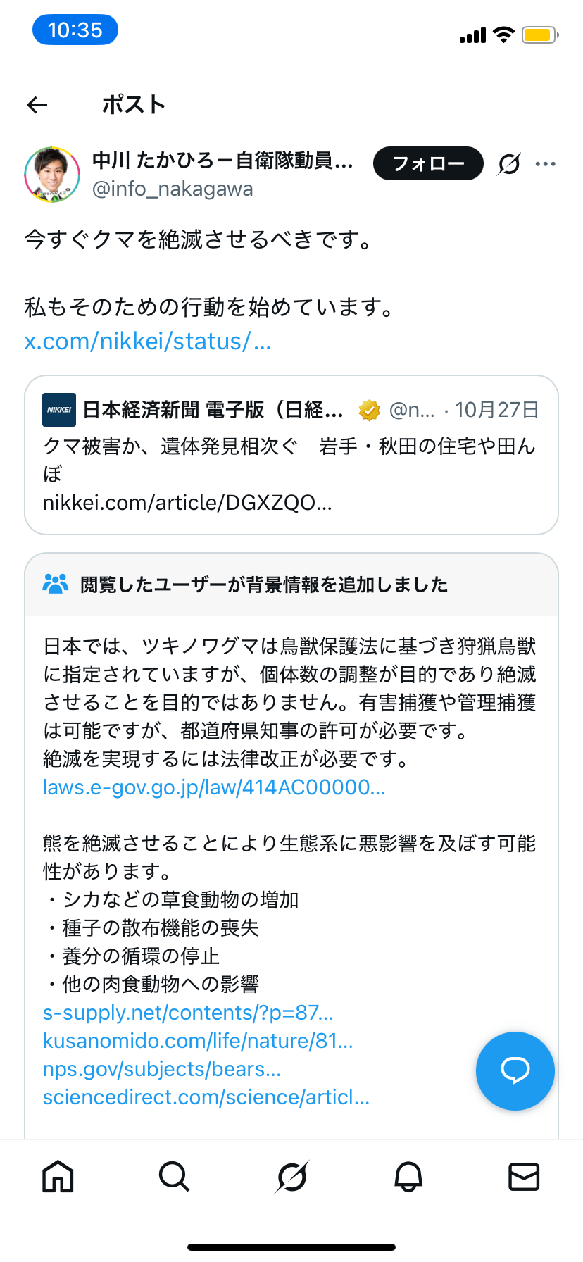 維新議員「今すぐ熊を絶滅させるべき。私は既に行動を起こしてます」→炎上wwwwwwwww Twitter Facebook はてブ LINE コピー 2025.10.30 スポンサーリンク 1:それでも動く名無し:2025/10/30(木) 11:05:13.66 ID:vgms6LLE0 2:それでも動く名無し:2025/10/30(木) 11:05:37.24 ID:vgms6LLE0 なんでや… 4:それでも動く名無し:2025/10/30(木) 11:06:43.71 ID:gT9KQ+JrM 法律改正に向けて動いていくなら別にええやん 5:それでも動く名無し:2025/10/30(木) 11:07:02.35 ID:90e0Ephu0 熊より鹿のが被害額大きいんだよなあ だから絶滅させるなら鹿→熊じゃないと農作物とかへの被害がとんでもないことになる 続きを読む
