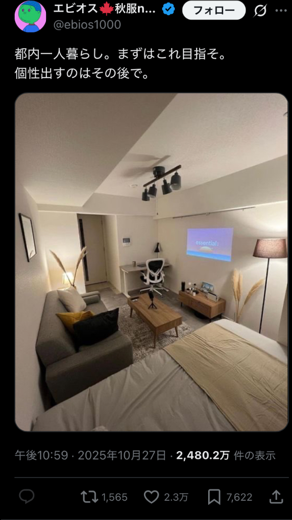こういう都内のウサギ小屋みたいな狭い家で一生懸命オシャレにしようとしてる人見るとマジで見てて恥ずかしくなるし切ない… 普通の散らかった部屋よりも見てて痛々しい…