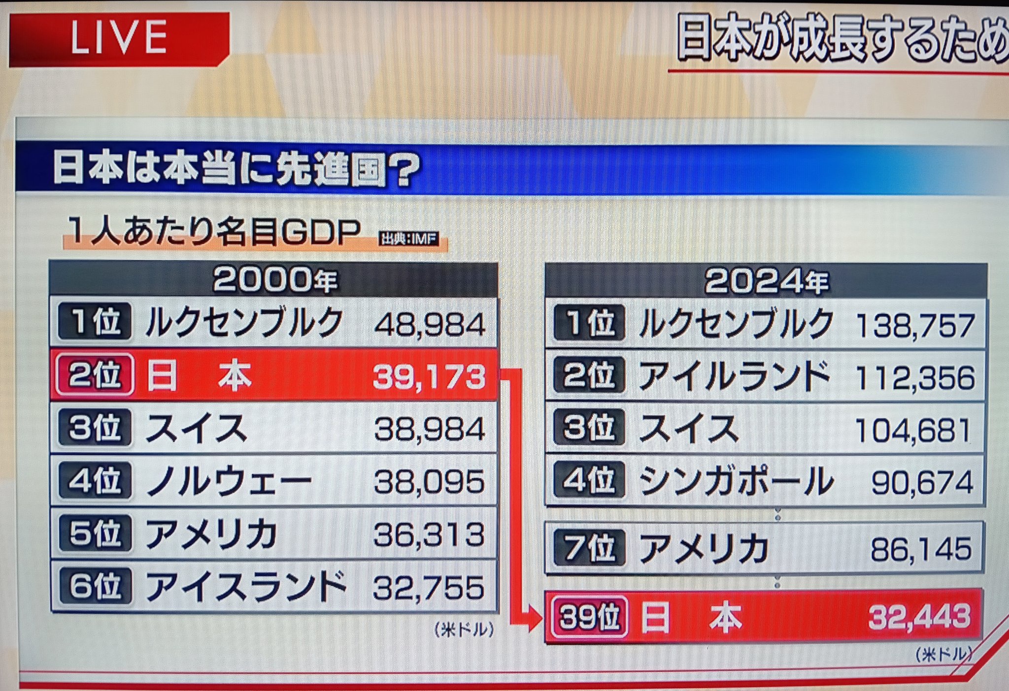 【画像】20年前の日本、ヤバすぎるwwwwwwwwwwwwwwwwww Twitter Facebook はてブ LINE コピー 2025.10.31 スポンサーリンク 1:以下、?ちゃんねるからVIPがお送りします:2025/10/30(木) 16:13:32.616 ID:BqTwDbv50.net スイスと北欧全てに1人あたりGDPで勝利 とんでもなく豊か 2:以下、?ちゃんねるからVIPがお送りします:2025/10/30(木) 16:15:11.442 ID:VfxHx/eT0.net やばいのはずっとトップクラス独走のルクセンブルクだな 8:以下、?ちゃんねるからVIPがお送りします:2025/10/30(木) 16:33:21.120 ID:l36fVU9j0.net >>2 あそこは国そのものが金融センター街みたいになってるからね 続きを読む