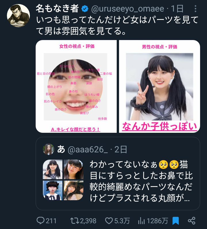 【画像】??「女は男と違って顔のパーツを細かく認識してます」←5万いいね!wwwwww Twitter Facebook はてブ LINE コピー 2025.11.05 スポンサーリンク 1:以下、?ちゃんねるからVIPがお送りします:2025/11/04(火) 19:15:24.153 ID:shyPxr9O0 これマジ? 2:以下、?ちゃんねるからVIPがお送りします:2025/11/04(火) 19:17:01.695 ID:gCVzkvdt0 必死でアラ探しして本人居ない時に陰口叩く為やで 続きを読む