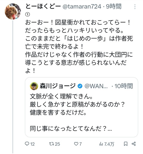 【悲報】はじめの一歩の森川ジョージ先生に直接文句を言った人、ボコボコに大炎上wwwwwww Twitter Facebook はてブ LINE コピー 2025.11.06 スポンサーリンク 1:以下、?ちゃんねるからVIPがお送りします:2025/11/05(水) 19:53:11.186 ID:Nx6fvdSd0 まあわかるけどさ 3:以下、?ちゃんねるからVIPがお送りします:2025/11/05(水) 19:53:30.375 ID:Nx6fvdSd0 正直なんかグダグダ過ぎてもう読んでないから未完で終わってもいいかな 続きを読む