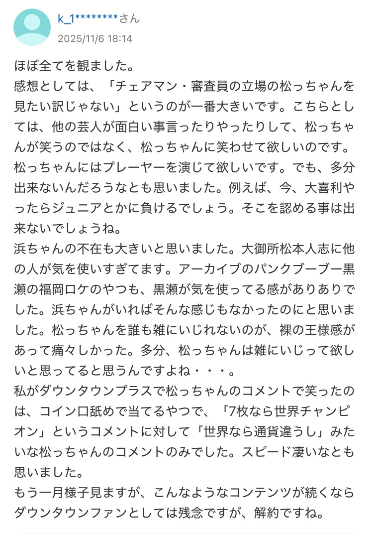 もう一月様子見ますが、こんなようなコンテンツが続くならダウンタウンファンとしては残念ですが、解約ですね。