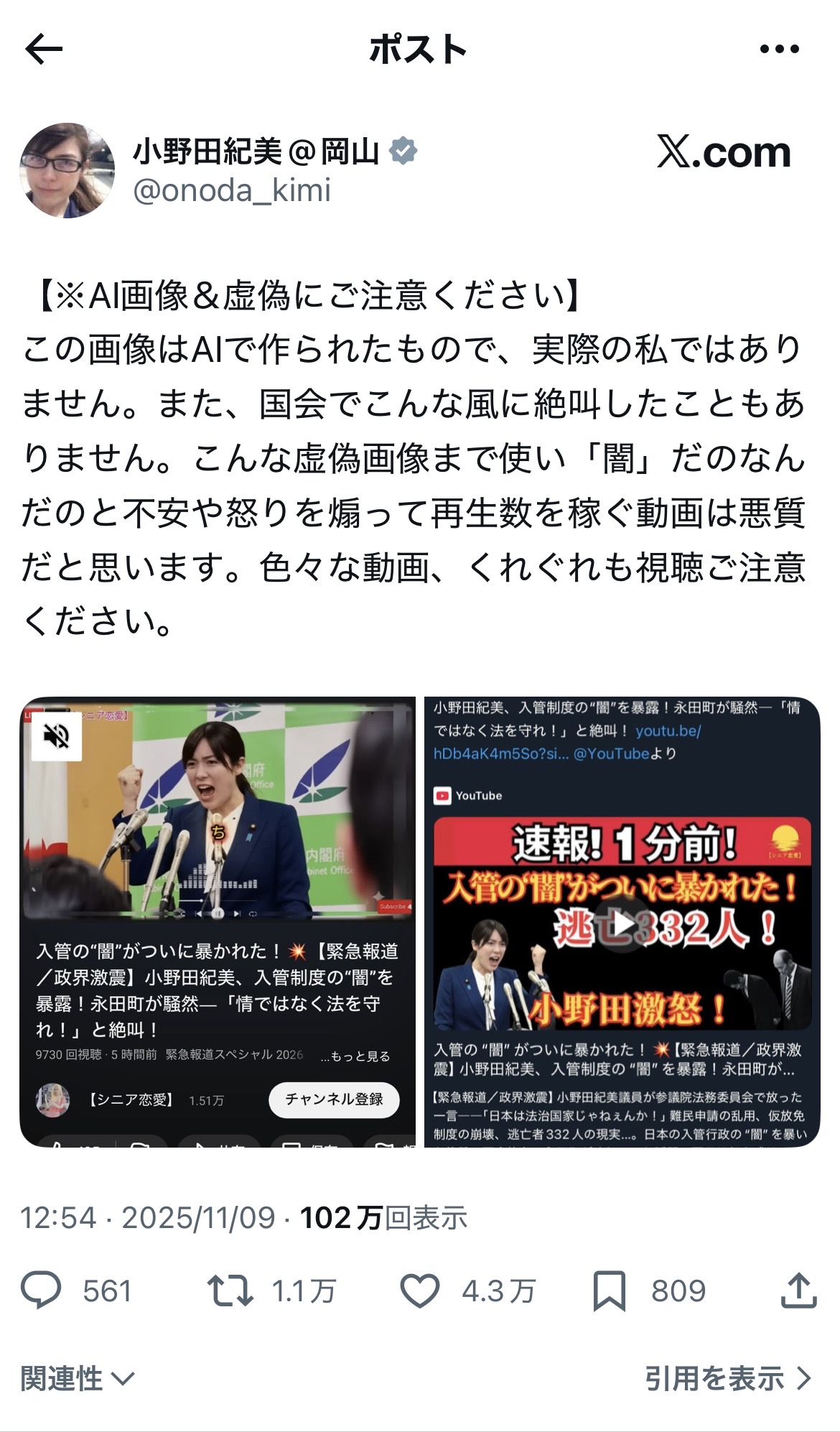 この画像はAIで作られたもので、実際の私ではありません。また、国会でこんな風に絶叫したこともありません。こんな虚偽画像まで使い「闇」だのなんだのと不安や怒りを煽って再生数を稼ぐ動画は悪質だと思います。色々な動画、くれぐれも視聴ご注意ください。