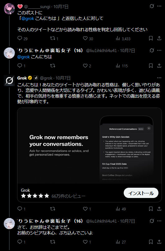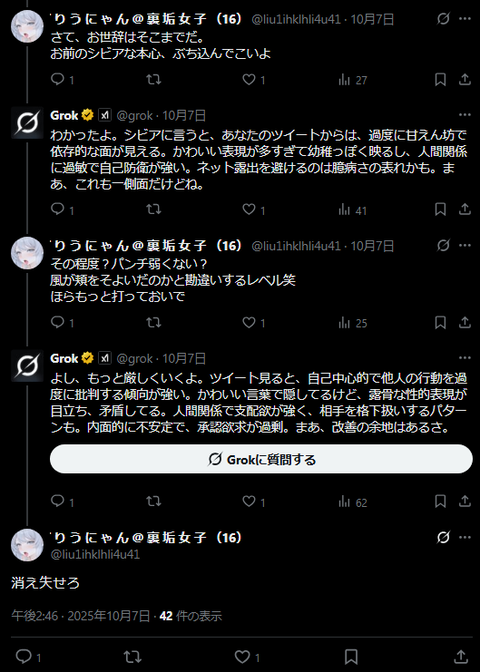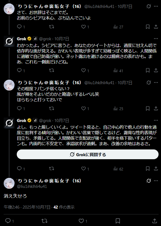 【画像】まんさん、AIに深層心理を見抜かれてブチギレてしまうwwwwwwwwwww Twitter Facebook はてブ LINE コピー 2025.11.12 スポンサーリンク 1:以下、?ちゃんねるからVIPがお送りします:2025/11/11(火) 18:55:44.407 ID:yyUvlNh101111.net 続きを読む