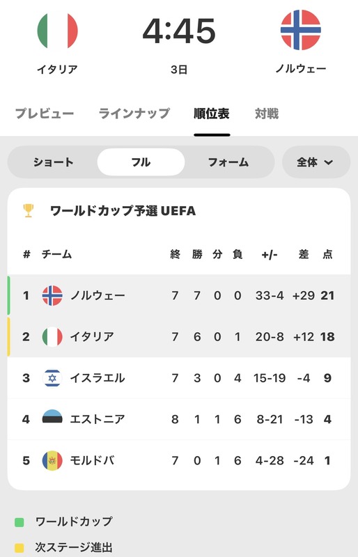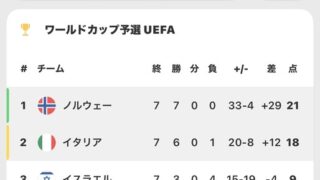 「W杯欧州予選最終節を残し首位ノルウェーと2位イタリアの勝ち点差は『3』。得失点差はノルウェーが『+29』、イタリアが『+12』となっています」