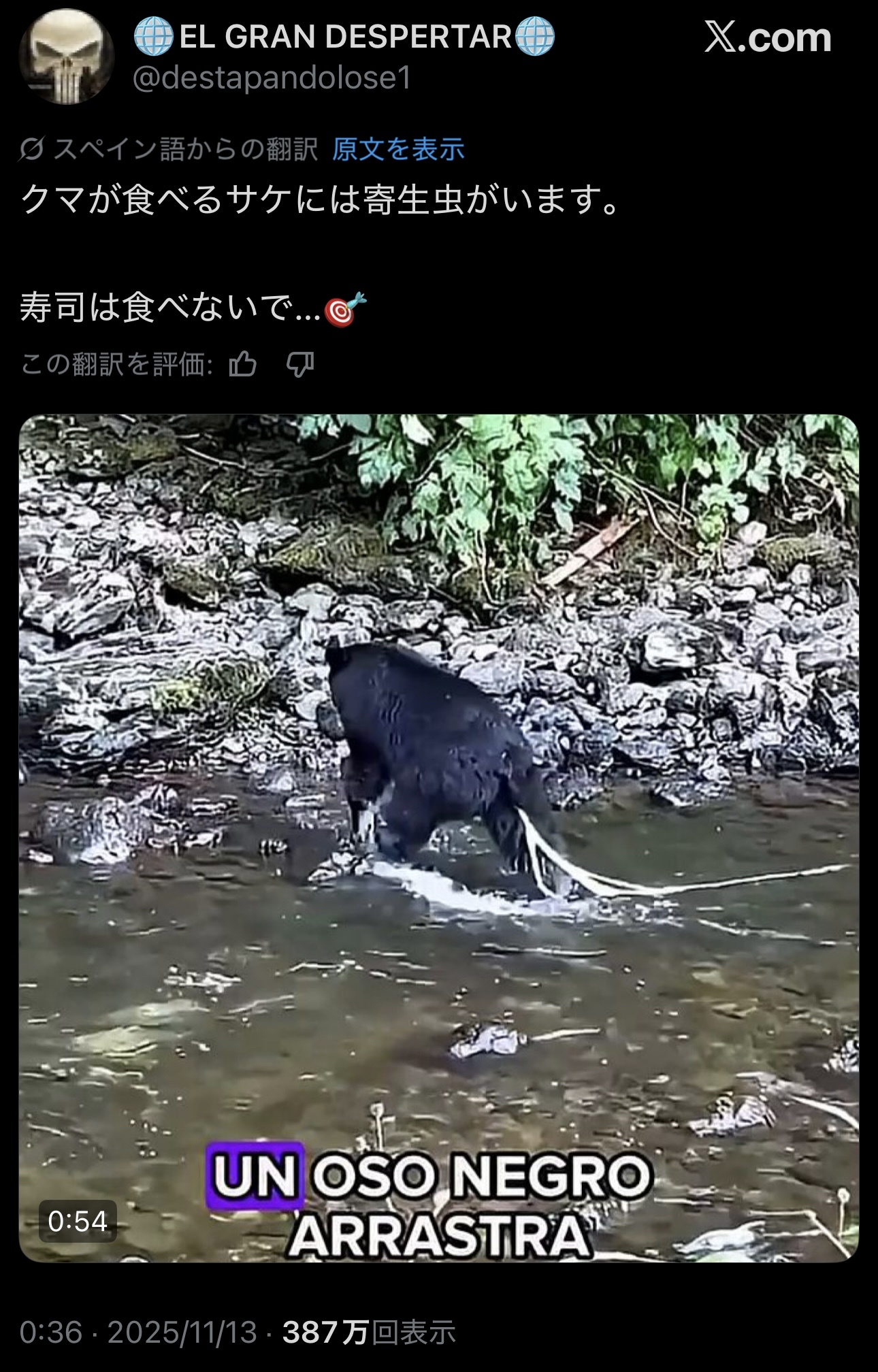 【動画】クマサン、生魚食いすぎてケツから寄生虫🪱垂れ流しwwwwwwwwwwwwwwwwwww Twitter Facebook はてブ LINE コピー 2025.11.15 スポンサーリンク 1:ダルナビルエタノール(茸) [US]:2025/11/14(金) 16:57:28.74 ID:YKf6nGTf0 BE:271912485-2BP(2000) 動画は>>2 2:名無しさん@涙目です。(茸) [US]:2025/11/14(金) 16:57:37.77 ID:YKf6nGTf0 BE:271912485-2BP(2000) 動画 https://video.twimg.com/ext_tw_video/1988…1280/W8XhrBdEyrMuMWrs.mp4 10:アメナメビル(愛知県) [US]:2025/11/14(金) 17:01:11.70 ID:FFMlq+O90 >>2 続きを読む