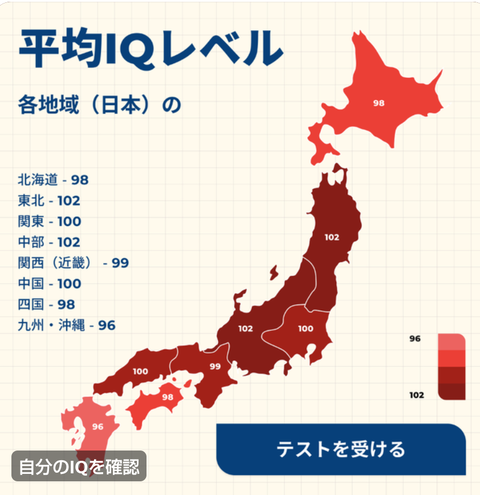 【画像】日本の各地域の平均IQwwwwwwwwwwwwwwwwwwwwwwww Twitter Facebook はてブ LINE コピー 2025.11.18 スポンサーリンク 1:それでも動く名無し:2025/11/17(月) 22:01:44.47 ID:eL1hzxyU0.net 3:それでも動く名無し:2025/11/17(月) 22:03:40.68 ID:uG+AETvZ0.net ワイが平均引き下げとるからワイの地域は+5にしといてくれ! 続きを読む