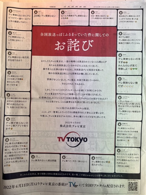 【画像】テレビ東京、謝罪 Twitter Facebook はてブ LINE コピー 2022.04.10 スポンサーリンク 1:風吹けば名無し:2022/04/10(日) 14:56:49.23 ID:O9ugSDcN0.net 5:風吹けば名無し:2022/04/10(日) 14:58:01.86 ID:PAan2SJGa.net エイプリルフールネタちゃうんかい 続きを読む