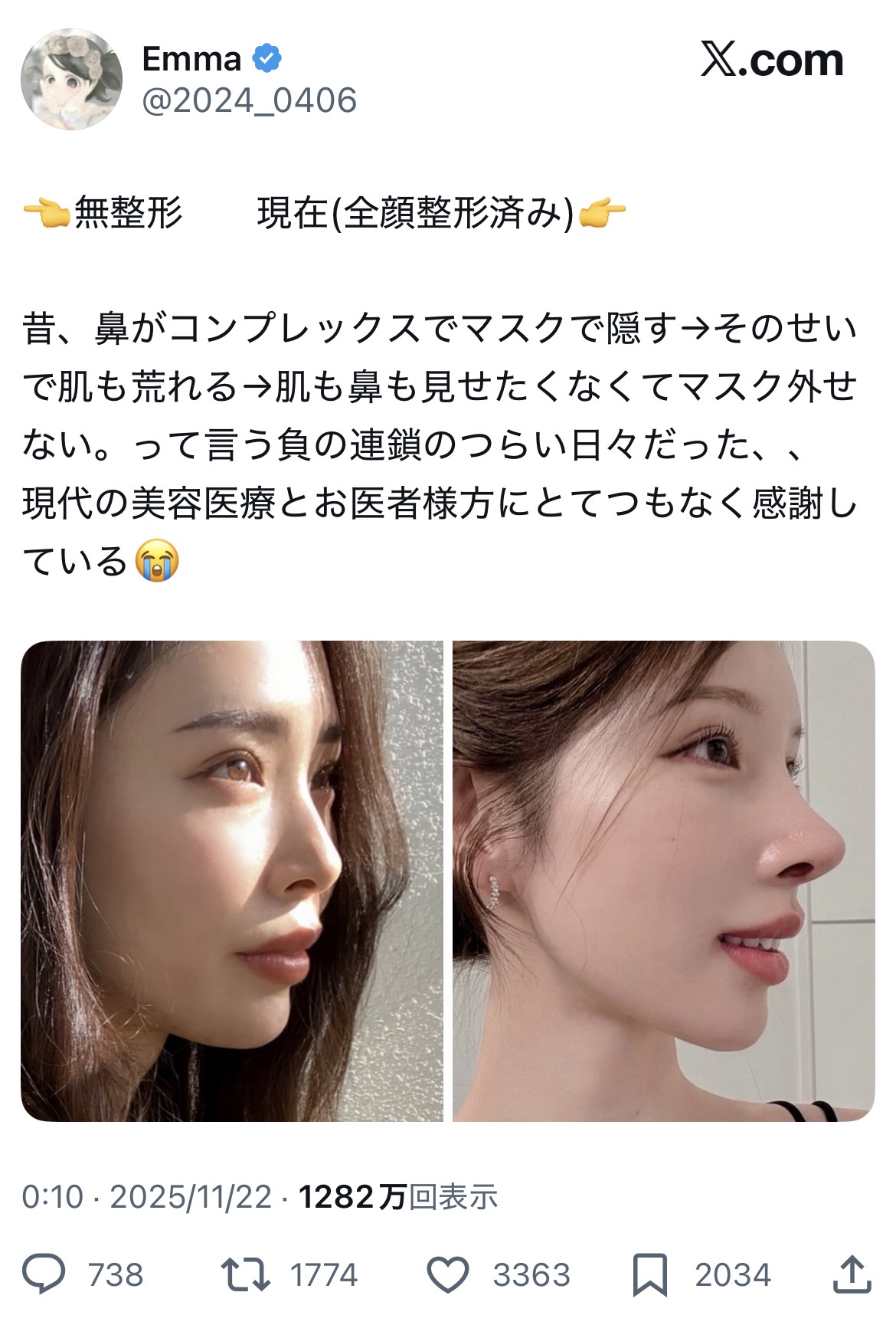 【画像】まんさん「鼻がコンプレックスだったがお医者様に感謝👩」 Twitter Facebook はてブ LINE コピー 2025.11.23 スポンサーリンク 1:それでも動く名無し:2025/11/23(日) 14:06:18.43 ID:CAsd879w0.net 3:それでも動く名無し:2025/11/23(日) 14:10:20.26 ID:bbGoI7nX0.net アメリカウケはしそう 45:それでも動く名無し:2025/11/23(日) 14:41:45.21 ID:yxXLegOHd.net >>3 鼻以外平らなのに鼻だけ高かったらアメリカ人びっくりでしょ 続きを読む