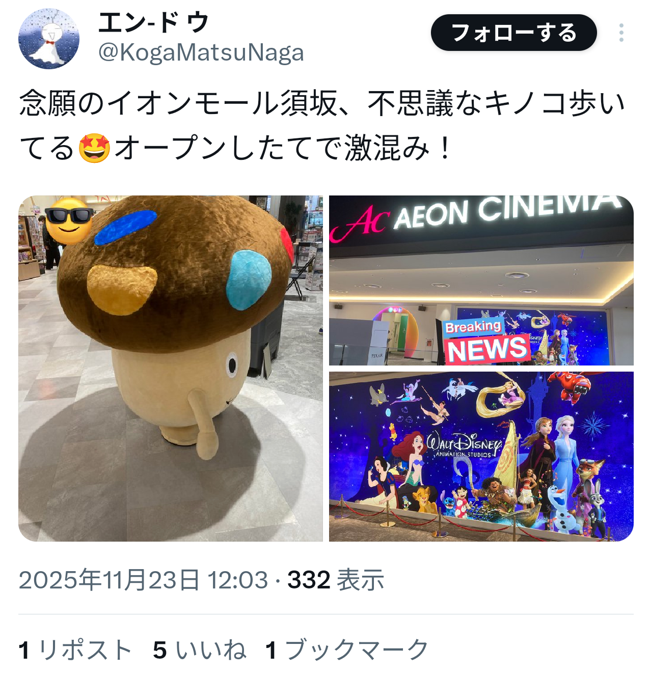 【画像】X民「イオンモールに謎のキノコが歩いてる!!!」→5いいねwwwwwwww Twitter Facebook はてブ LINE コピー 2025.11.24 スポンサーリンク 1:それでも動く名無し:2025/11/23(日) 15:55:21.61 ID:IEPYPqlI0 2:それでも動く名無し:2025/11/23(日) 15:55:30.78 ID:IEPYPqlI0 3:それでも動く名無し:2025/11/23(日) 15:55:38.20 ID:jNe1wd720 悲しいなぁ 続きを読む