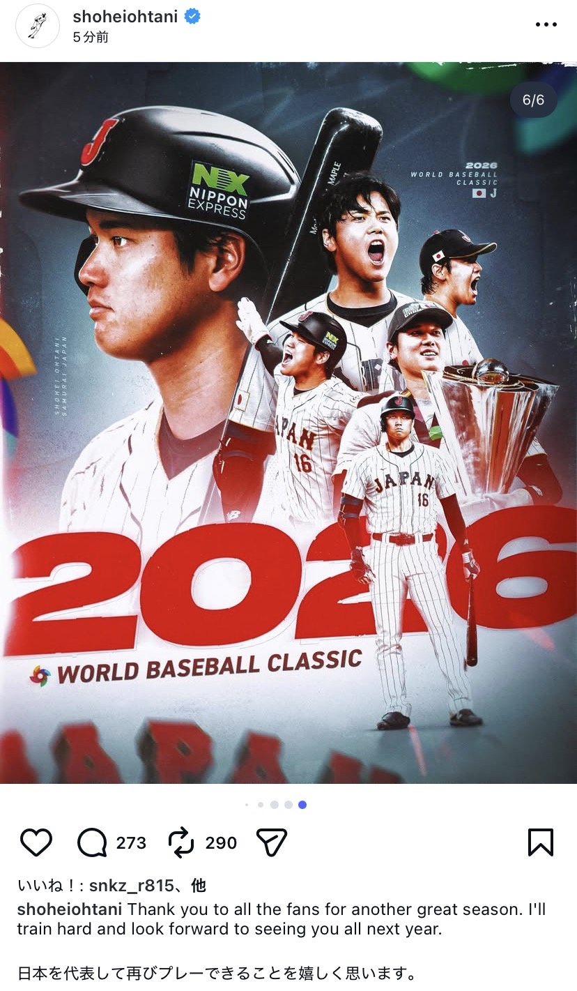 大谷は自身のインスタグラムで、WBCへの参加を示唆。2023年大会の写真を投稿し「日本を代表して再びプレーできることを嬉しく思います」とつづった。 pic.twitter.com/Zc66t0w9MP