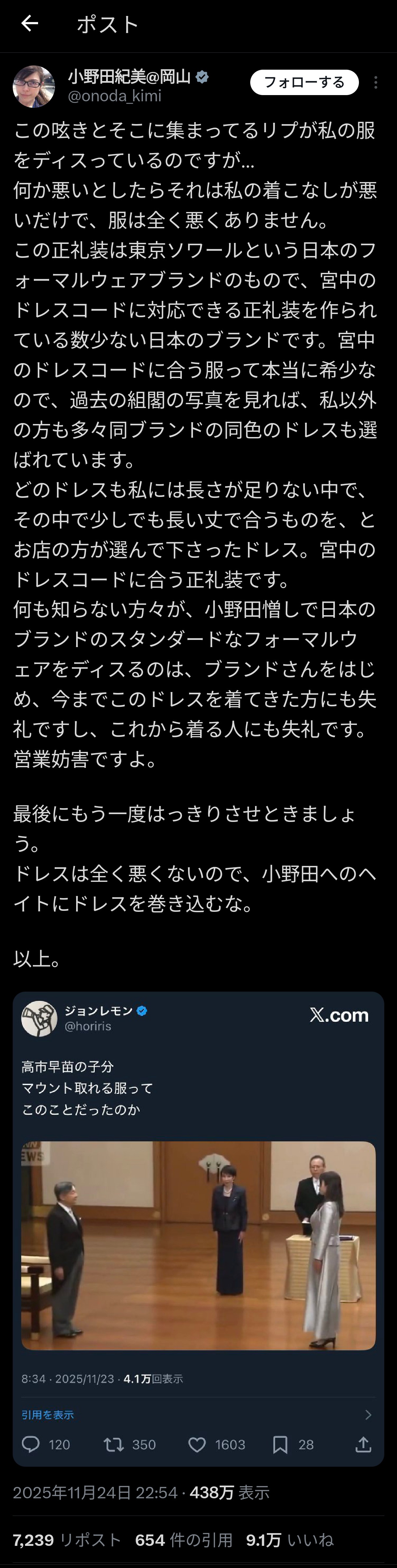 — 小野田紀美@岡山 (@onoda_kimi) November 24, 2025
