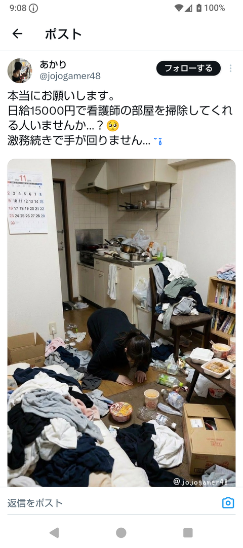 【画像】看護師(23)さん、汚部屋の清掃を募集してしまうwwwwwwwwwwwwwwwwww Twitter Facebook はてブ LINE コピー 2025.11.28 スポンサーリンク 1:それでも動く名無し:2025/11/28(金) 09:10:56.69 ID:KLTFewLC0 2:それでも動く名無し:2025/11/28(金) 09:11:30.05 ID:qGIXJV0g0 準カリ 3: 警備員[Lv.2][新芽]:2025/11/28(金) 09:11:34.09 ID:DE8jlP8S0 業者に頼めばいいだろ 続きを読む