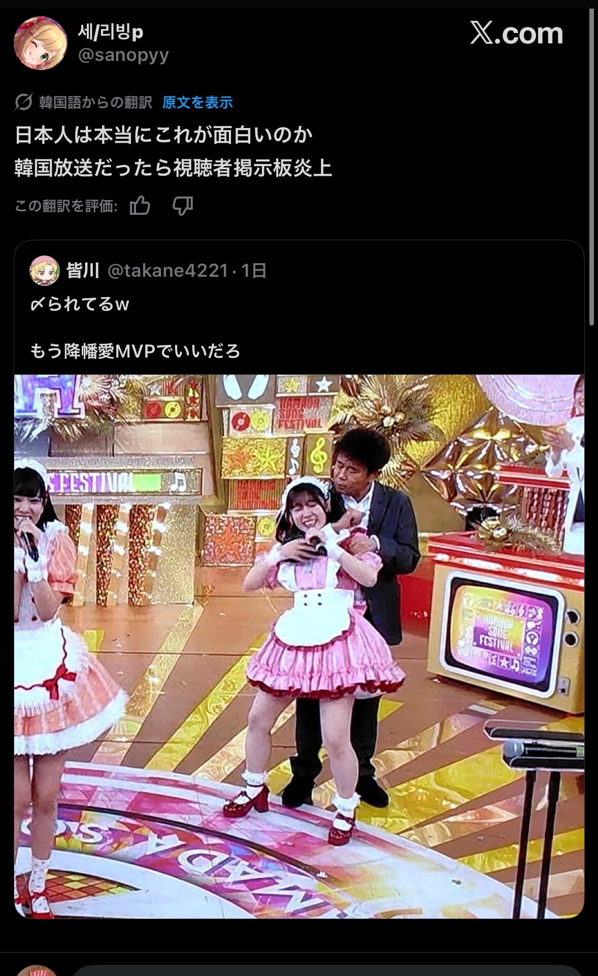 【悲報】浜田雅功を知らない韓国人さん、ブチギレてしまう (※画像あり) Twitter Facebook はてブ LINE コピー 2025.11.30 スポンサーリンク 1:それでも動く名無し:2025/11/30(日) 14:48:04.03 ID:oEmYvrwx0 そうか、向こうの人は浜ちゃん知らんのか 3:それでも動く名無し:2025/11/30(日) 14:49:13.61 ID:6J4Iu2BK0 なぜ日本のテレビを見るの? 4:それでも動く名無し:2025/11/30(日) 14:50:08.27 ID:Qrhx05Ge0 韓国じゃないからええやろ 続きを読む