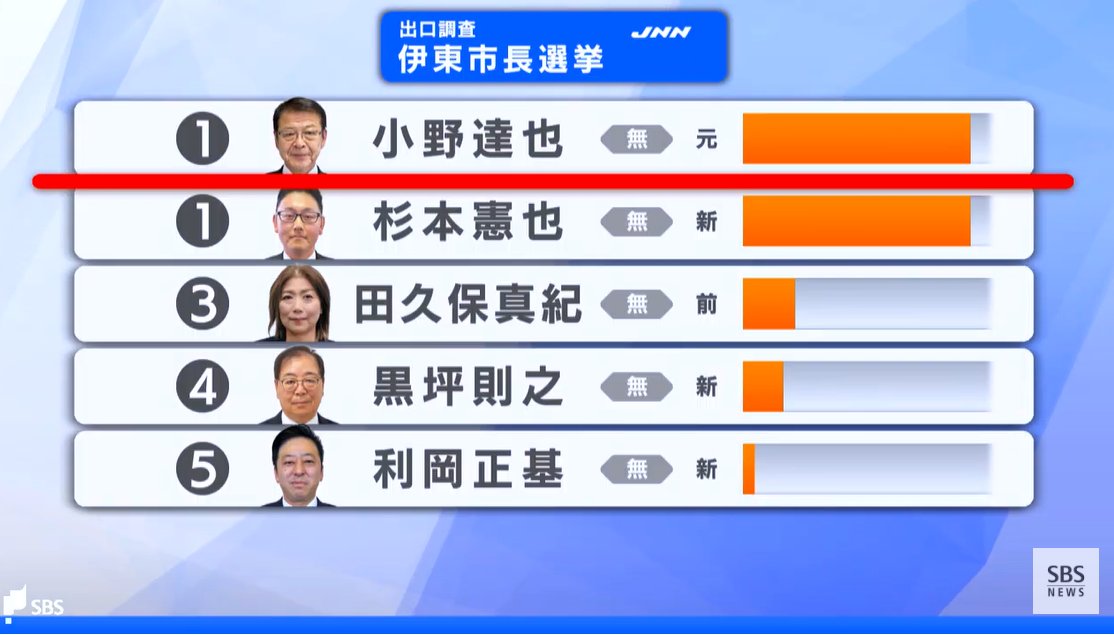 共同通信などの出口調査で田久保真紀前市長の落選が確実となった。国民民主党推薦の元市議杉本憲也氏と自民党推薦の元職小野達也氏が激しく競り合っているという。