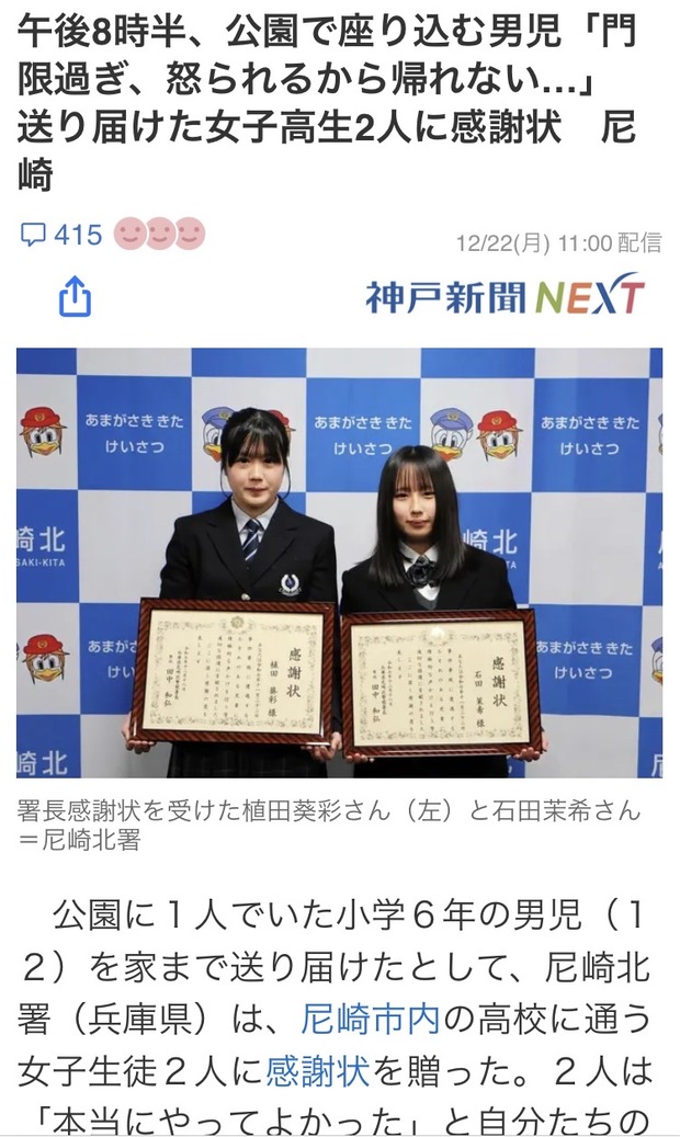 【画像】ガキにシカトされたJK、男友達を呼んで鬼詰めに感謝状 Twitter Facebook はてブ LINE コピー 2025.12.23 スポンサーリンク 1 : 以下、?ちゃんねるからVIPがお送りします :2025/12/22(月) 20:41:08.771 ID:5QSuxXpc0.net 午後8時半、公園で座り込む男児「門限過ぎ、怒られるから帰れない…」 送り届けた女子高生2人に感謝状 尼崎(神戸新聞NEXT) - Yahoo!ニュースhttps://news.yahoo.co.jp/articles/79b8422ea644bd70da419f76f89ac358ce31a5a6転載元スレッド:https://viper.2ch.sc/test/read.cgi/news4vip/1766403668/ 続きを読む