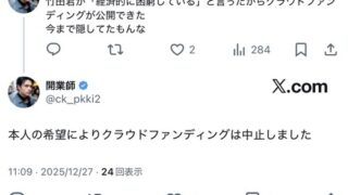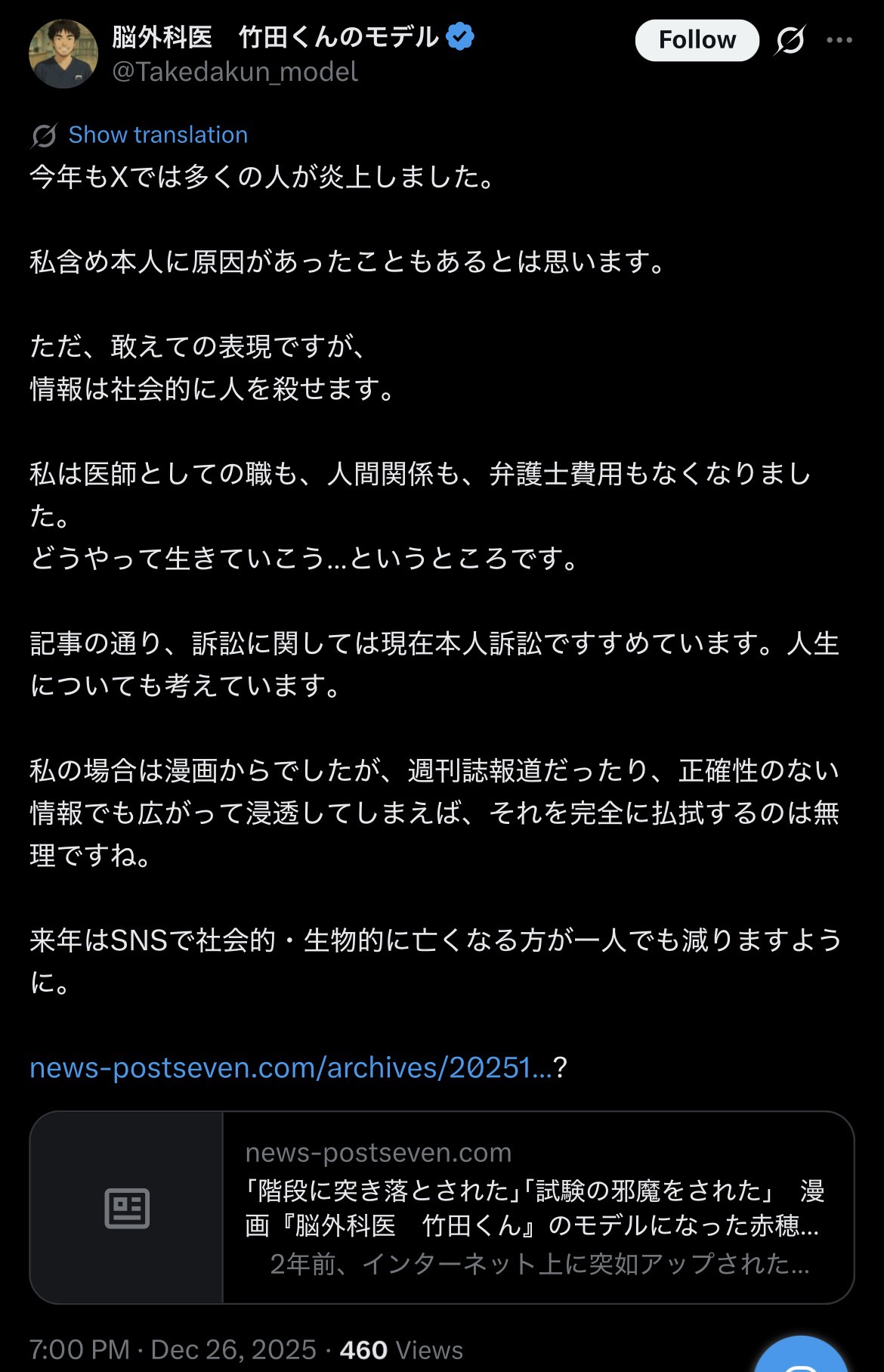 【悲報】脳外科医 竹田くんのモデルを助けるクラウドファンディング、開始即中止 Twitter Facebook はてブ LINE コピー 2025.12.27 スポンサーリンク 1:それでも動く名無し:2025/12/27(土) 12:33:53.83 ID:lpxsCf7f0 2:それでも動く名無し:2025/12/27(土) 12:34:16.63 ID:lpxsCf7f0 私は殺された 3:それでも動く名無し:2025/12/27(土) 12:34:47.64 ID:TnGo2qWp0 人を死に追いやっておいて何を 続きを読む