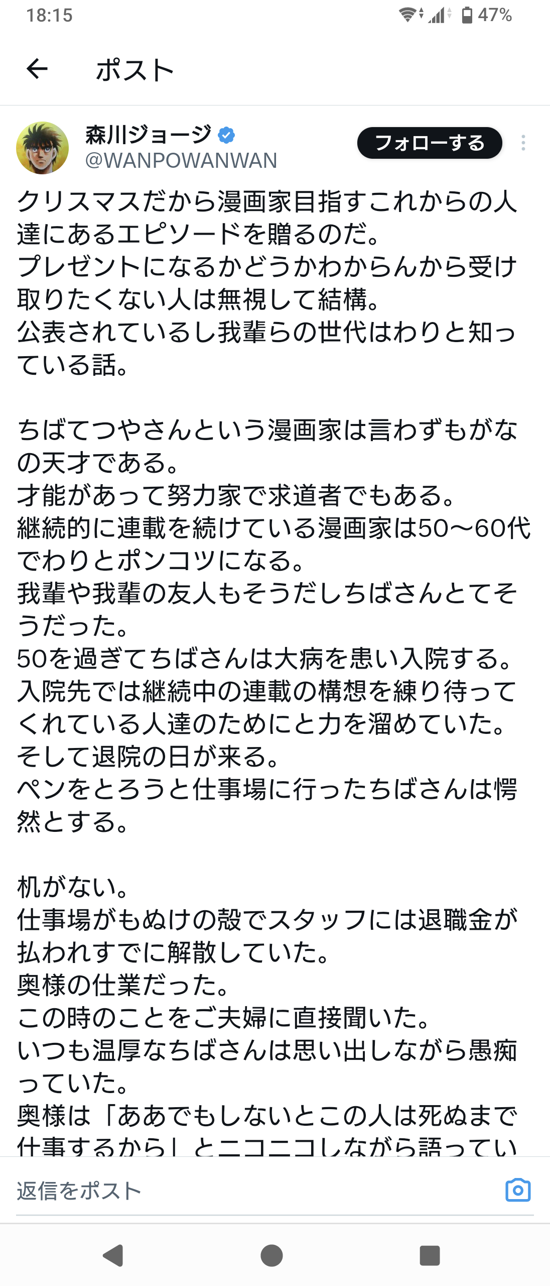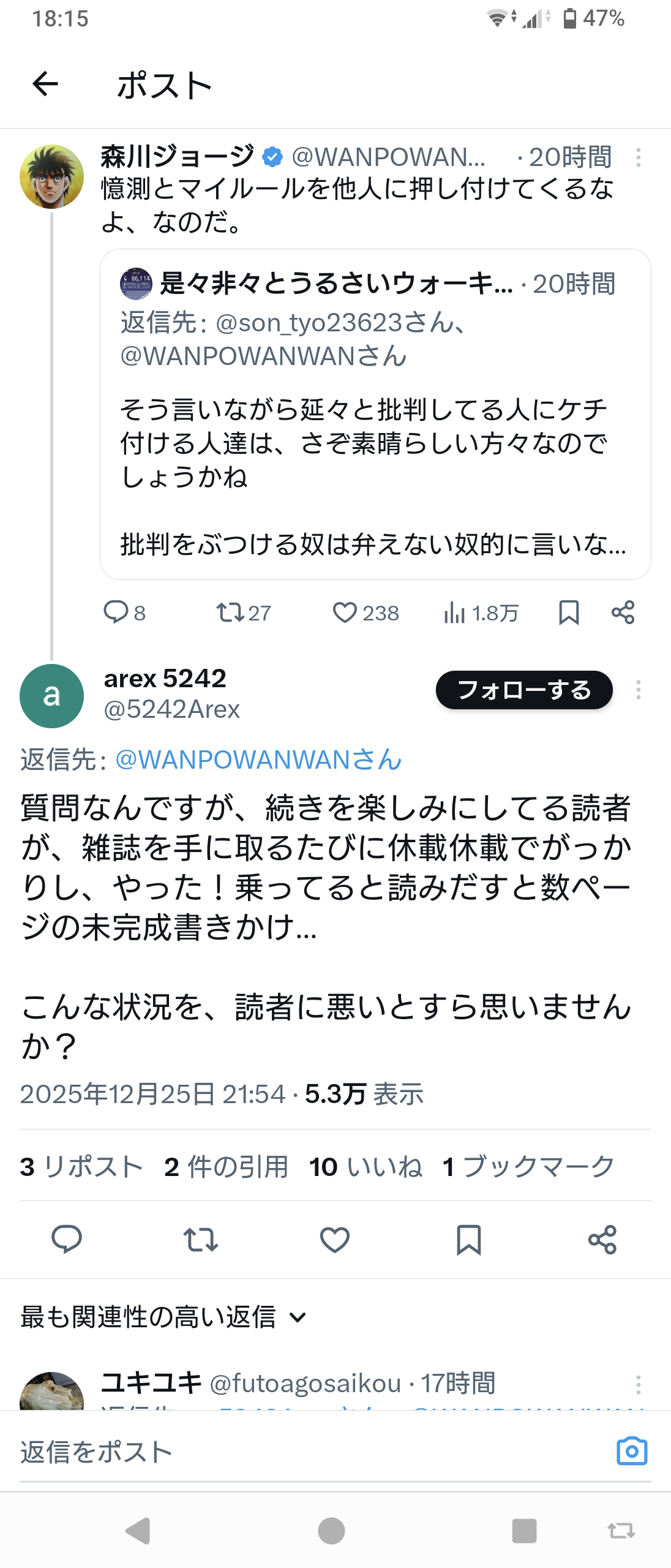 はじめの一歩の作者、休み過ぎな事をファンに咎められてめっちゃ効いてしまう Twitter Facebook はてブ LINE コピー 2025.12.28 スポンサーリンク ◇ 1: 名無し 2025/12/26(金) 18:18:18.08 ID:Wjtq2CwF0 https://x.com/WANPOWANWAN/status/2004110040685597115 ◇ 4: 名無し 2025/12/26(金) 18:22:28.75 ID:qihmAwMJ0 健康のために引き延ばしやめて完結させよう! ◇ 5: 名無し 2025/12/26(金) 18:23:02.97 ID:riFEgtJ+0 ジム経営に手を出しておいて原稿描かないのは健康のため主張は草 続きを読む