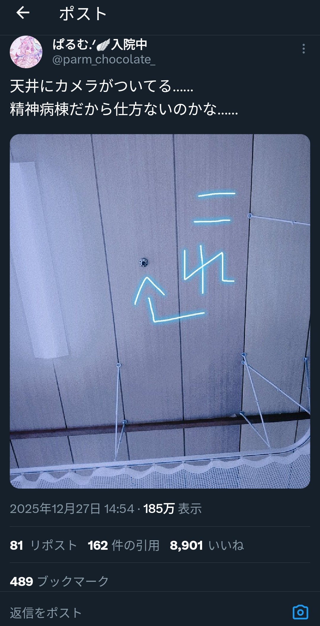 【画像】まんさん「ギャオオオオン!寝室の天井に防犯カメラがあるううううううううう!」 Twitter Facebook はてブ LINE コピー 2025.12.28 スポンサーリンク 2:それでも動く名無し:2025/12/27(土) 22:01:37.39 ID:jU6bPwDi0.net 3:それでも動く名無し:2025/12/27(土) 22:02:21.59 ID:b4TsMgtC0.net 精神病棟ってスマホ持ち込めるんか 4:それでも動く名無し:2025/12/27(土) 22:02:31.65 ID:8HWTTd1E0.net 精神病棟で草 続きを読む