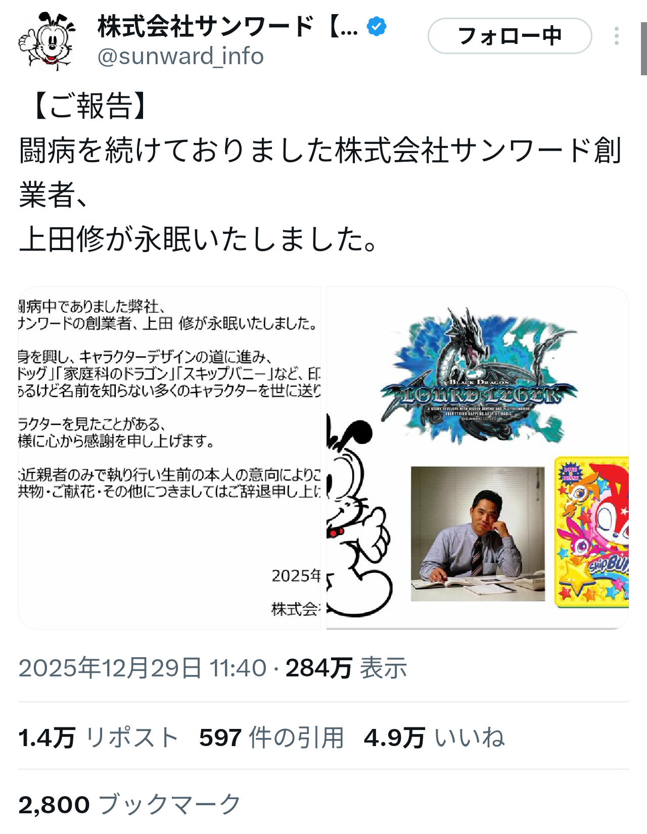【訃報】家庭科のドラゴンの原作者、お亡くなりになる Twitter Facebook はてブ LINE コピー 2025.12.30 スポンサーリンク 1:それでも動く名無し:2025/12/29(月) 17:51:48.97 ID:wQSInV0/0NIKU 2:それでも動く名無し:2025/12/29(月) 17:51:53.94 ID:wQSInV0/0NIKU 3:それでも動く名無し:2025/12/29(月) 17:52:59.95 ID:7Z73rGS30NIKU マジかよ… 続きを読む
