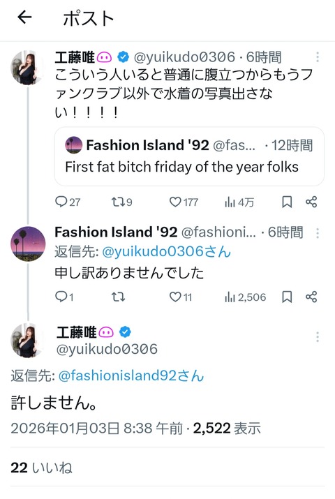 爆胸グラビアアイドル、ブチギレ 「もう水着の写真SNSに載せない!!」 (※画像あり) Twitter Facebook はてブ LINE コピー 2026.01.03 スポンサーリンク 1:それでも動く名無し:2026/01/03(土) 16:16:09.62 ID:70z4/sWB0 3:それでも動く名無し:2026/01/03(土) 16:18:08.77 ID:9mCgguIGa むほほ! 続きを読む