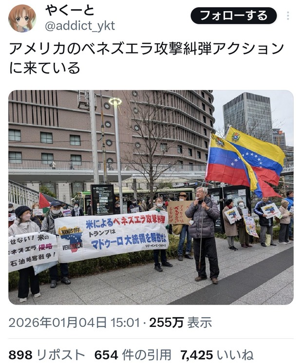 日本で早速マドゥロ氏解放デモが行われてる件。いつもの面々で草 Twitter Facebook はてブ LINE コピー 2026.01.06 スポンサーリンク 1:2026/01/06(火) 09:25:58.72 ID:EwMFx7n80マジか……マドゥーロ解放しろって言ってるマジか……バカかこいつら……(´・ω・`) https://t.co/nSL7P5VKqp— フラウフェン@ジョー (@hz2uHyoP7hTW9Pk) January 5, 2026転載元スレッド:https://hayabusa3.2ch.sc/test/read.cgi/news/1767659158/ 続きを読む