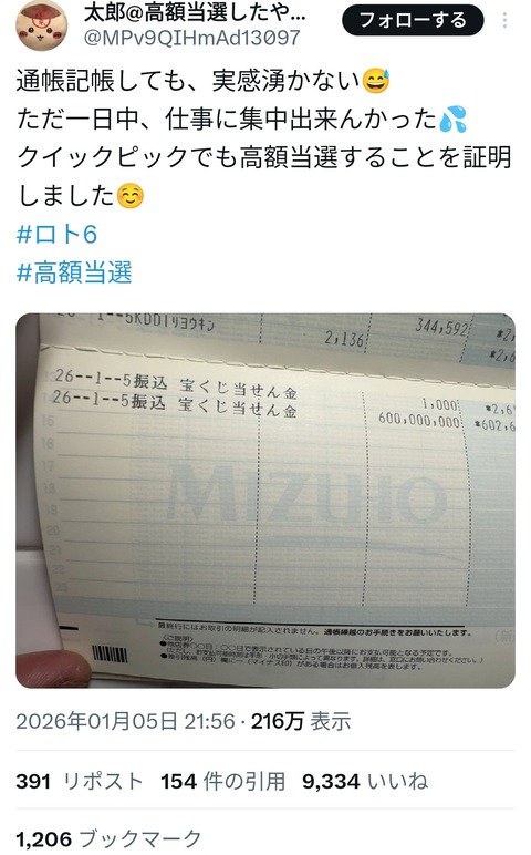 【画像】宝くじの高額当選者、現るwwwwwwwwwwwwwwwwwwwwwwwww Twitter Facebook はてブ LINE コピー 2026.01.06 スポンサーリンク 1:以下、?ちゃんねるからVIPがお送りします:2026/01/06(火) 08:35:07.753 ID:oyXaCqOg0 2:以下、?ちゃんねるからVIPがお送りします:2026/01/06(火) 08:35:15.493 ID:oyXaCqOg0 うおおおおおおおおおおおおおおおおおおおおおおお 4:以下、?ちゃんねるからVIPがお送りします:2026/01/06(火) 08:35:58.598 ID:Ogd//8QP0 今DMめっちゃいってるだろうな 続きを読む