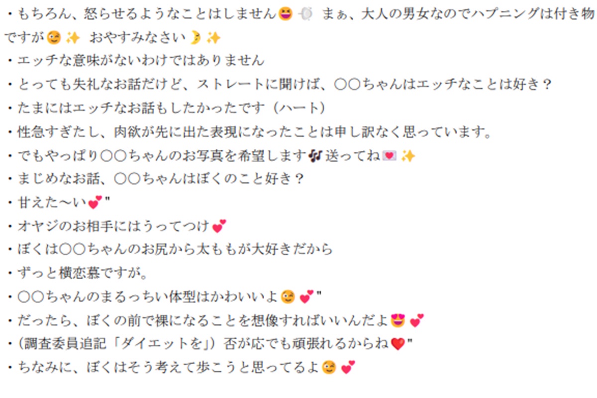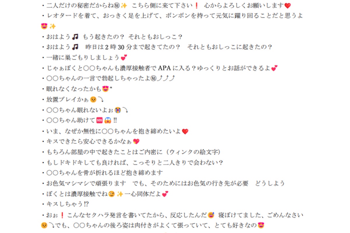 〈○○ちゃんのことを考えると体が熱くなるの(笑顔の絵文字)〉〈だったら、ぼくの前で裸になることを想像すればいいんだよ(目がハートの絵文字)〉