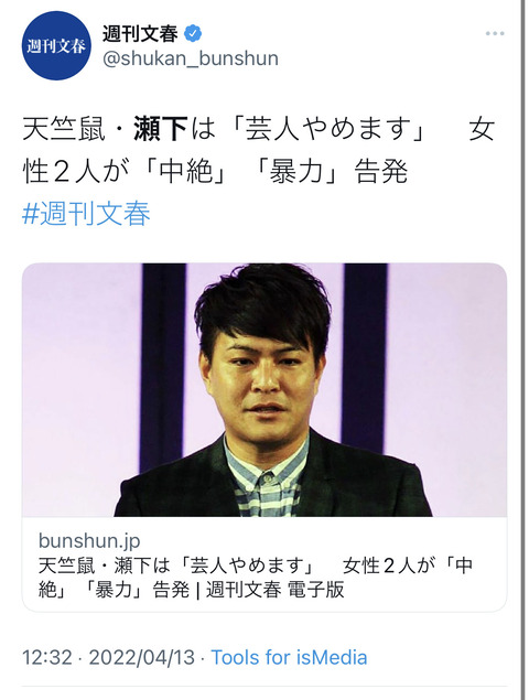 【文春】天竺鼠・瀬下「芸人やめます」女性2人が「中絶」「暴力」告発 Twitter Facebook はてブ LINE コピー 2022.04.13 スポンサーリンク 1:風吹けば名無し:2022/04/13(水) 15:29:29 https://bunshun.jp/denshiban/articles/b2885 3:風吹けば名無し:2022/04/13(水) 15:33:00.30 ID:05IF4LZaa.net せっかくちょっと売れてきたのに 5:風吹けば名無し:2022/04/13(水) 15:34:32.84 ID:8DcmMRhC0.net ピーンチ! 6:風吹けば名無し:2022/04/13(水) 15:34:57.96 ID:saThHZhV0.net 中絶はあかんわ 終わったな 続きを読む