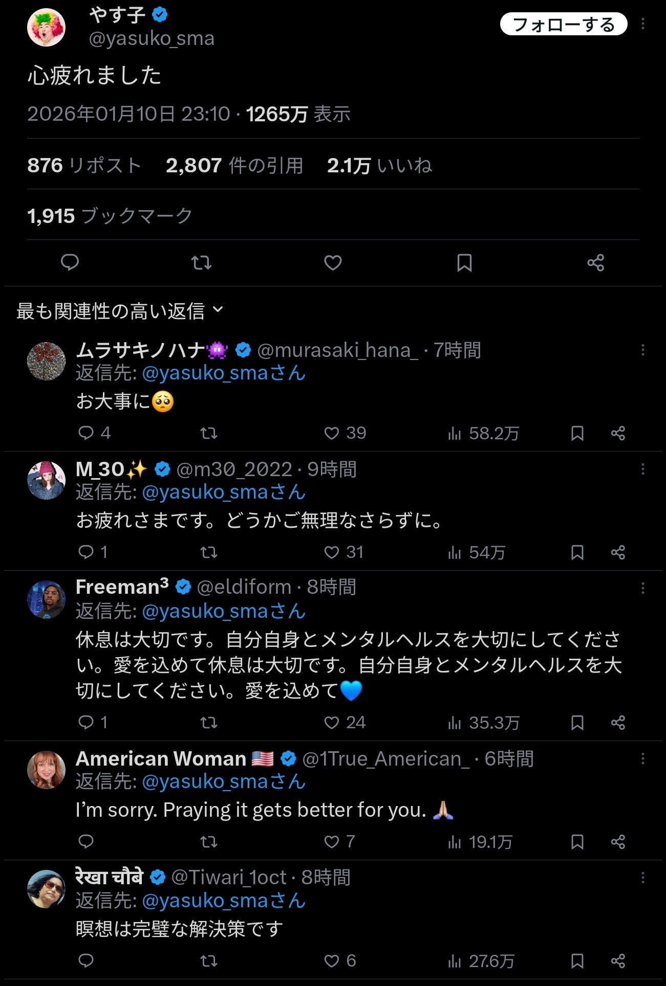 この投稿に対し「お大事に」「やす子ちゃん、心疲れたって言葉見てこっちまで胸がぎゅってなったよ…」「少し休んで、自分を労わってあげてね」「どうかご無理なさらずに」「どうぞ、少し休んでください」「無理せず休もう」「どうしたの?」